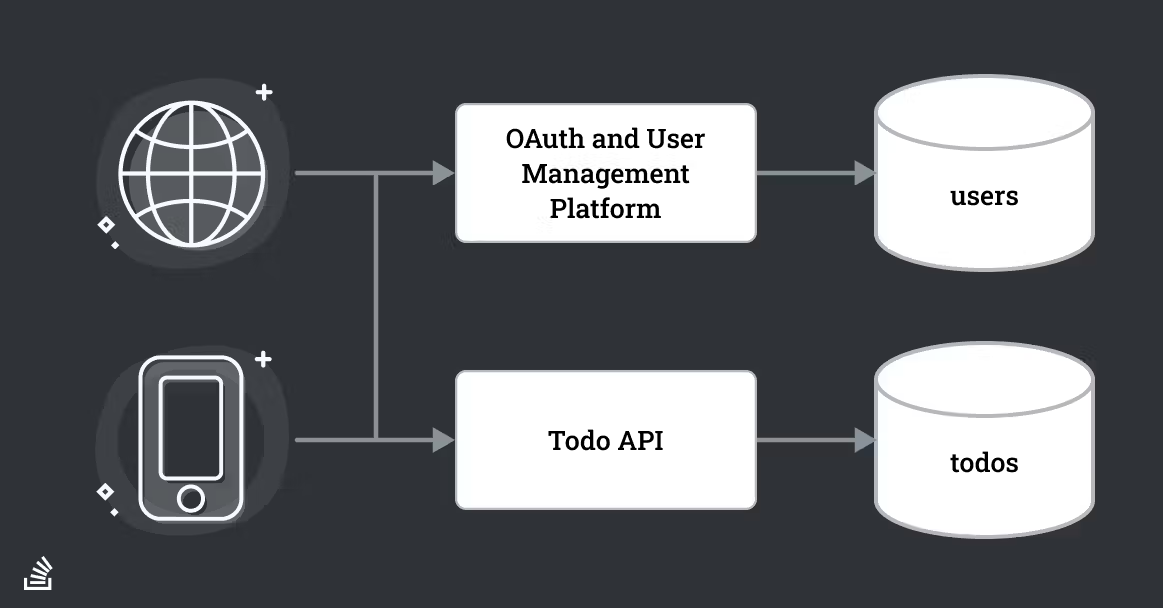 Consider a simple application, diagrammed above, which allows users to manage todos. Clients like a web browser or mobile app will access two different components: an OAuth platform to authenticate users and a Todo API to add, update, or delete todos.
