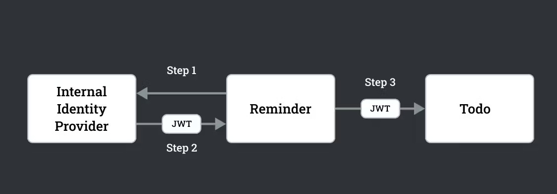 In that case, we need a reminder service which would run every day, see which todos were due, and send a reminder email. This service would still need to authenticate because we wouldn’t want anyone to be able to access our todos. But there is no user kicking off the request—perhaps its only a cron job.